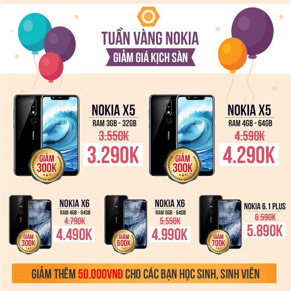- Nokia X5 RAM 4GB/64GB: giảm 4.590K chỉ còn 4.290K đồng giá các màu
