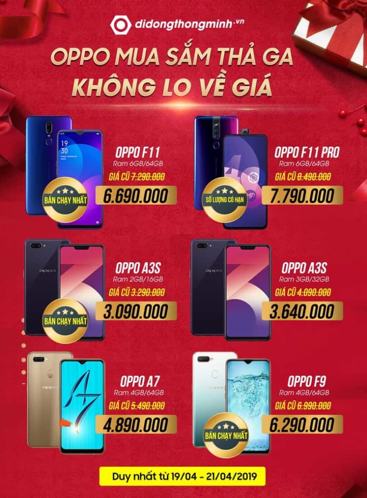 Tại Di Động Thông Minh, những model mới của Oppo đang được niêm yết giảm giá tới cả triệu đồng, nhất là những sản phẩm đang hot như Oppo A3S hay Oppo F9, Oppo F11. Cụ thể: