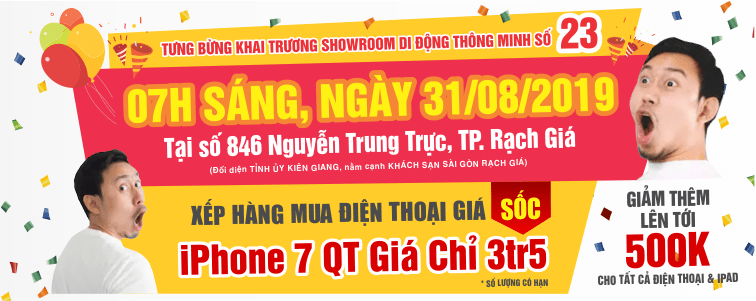 Showroom DĐTM Rạch Giá (Showroom thứ 3 tại Miền Tây, thứ 23 trong chuỗi hệ thống bán lẻ Di Động Thông Minh uy tín toàn quốc) chính thức Tưng bừng khai trương: Đến là có Quà 300K, Mua là giảm Giá tới 500K toàn bộ Điện thoại & Máy tính bảng vào ngày 31/8/2019 (Thứ 7) để tiếp tục sứ mệnh phục vụ và mang tới bà con tại Tỉnh Kiên Giang những sản phẩm điện thoại, máy tính bảng, phụ kiện và đồ chơi công nghệ “ngon, bổ, rẻ” nhất.