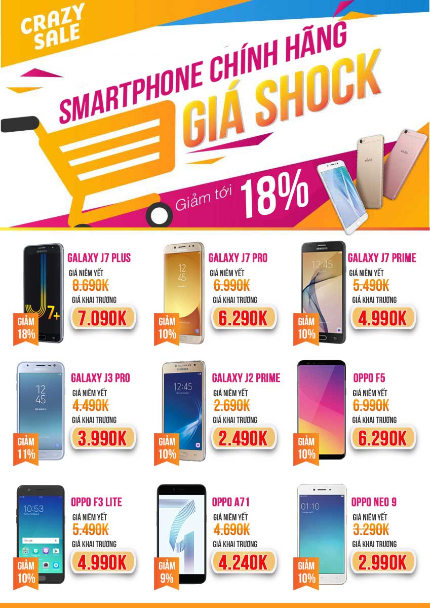 Trong ngày khai trương rất nhiều sản phẩm Samsung, Oppo chính hãng đều được giảm giá trực tiếp, tặng tiền mặt ngay cho khách hàng, mức giảm từ 9-18% tuỳ từng sản phẩm, nhiều máy có hỗ trợ trả góp lãi suất 0% dành cho khách hàng. Tất cả đều được tặng kèm Gậy chụp ảnh Selfie, thông tin chi tiết các bạn tham khảo dưới đây: