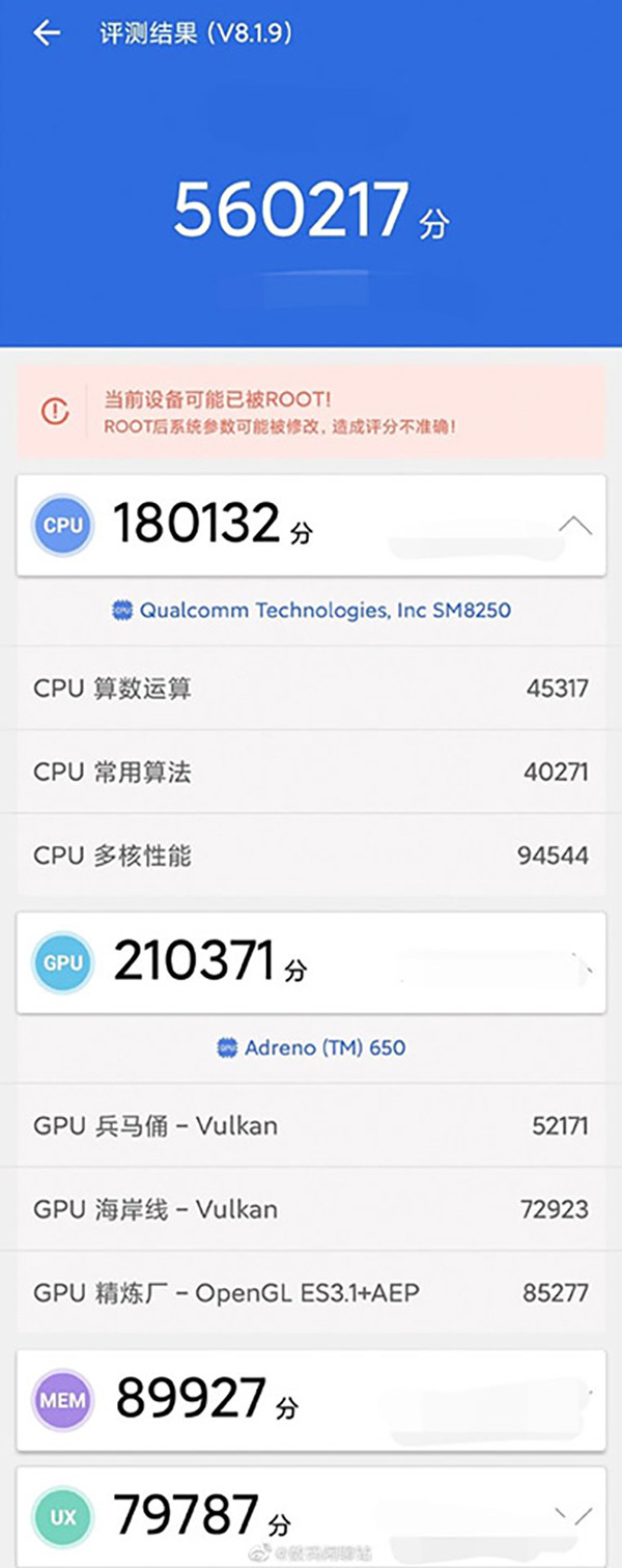 Theo như nguồn tin trên tiết lộ rằng Xiaomi Mi 10 được cung cấp sức mạnh bởi chipset Snapdragon 865, đi kèm GPU Adreno 650 và đạt điểm hiệu năng lên tới 560,217 điểm. Trong đó, các điểm thành phần lần lượt là 180,132 điểm CPU, 210,371 điểm GPU, 89,927 điểm bộ nhớ và 79,787 điểm UX.