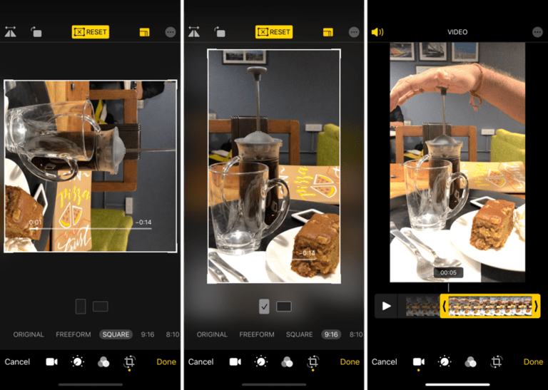 Những cải tiến tương tự và các tính năng chỉnh sửa cơ bản cũng áp dụng cho trình chỉnh sửa video mới. Với những tính năng cập nhật mới thì đây gần như là một phiên bản mini của ứng dụng iMovie cũ. Tất cả các tính năng chỉnh sửa video cơ bản đều có ở đây, bạn có thể cắt video thủ công hoặc sử dụng tỷ lệ khung hình hiện có, bạn cũng có thể nhanh chóng tắt tiếng âm thanh.