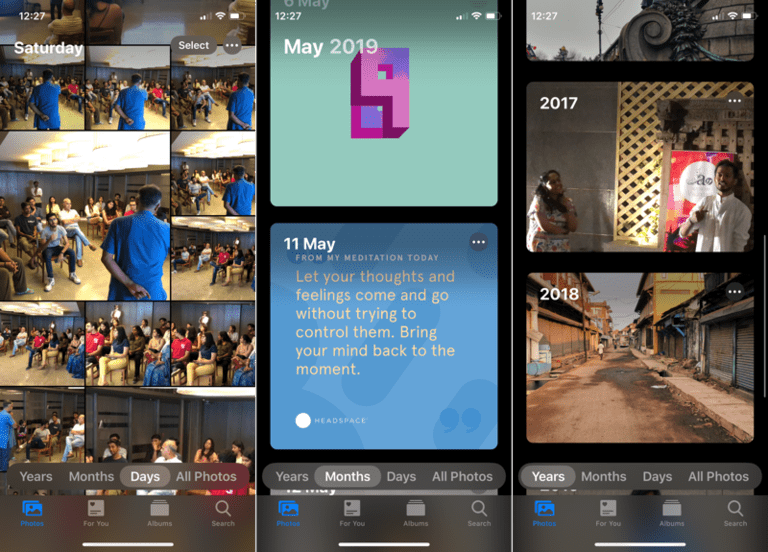 Chuyển sang phần Ngày sẽ hiển thị giao diện người dùng mới. Tại đây, bạn sẽ tìm thấy những bức ảnh đẹp nhất từ ngày nhất định, trong một mẫu lưới được thiết kế mới. Điện thoại iPhone của bạn sẽ phân tích tất cả các ảnh trong ngày và sẽ ẩn các ảnh là ảnh chụp màn hình hoặc ảnh văn bản. Sau đó, nó sẽ chọn bức ảnh đẹp nhất từ một nhóm các bức ảnh liên quan và sẽ giới thiệu nó cho bạn. Nếu bạn có 50 ảnh trong một ngày, tab Ngày sẽ hiển thị cho bạn 10 ảnh tốt nhất. Ảnh trực tiếp và Video sẽ tự động phát ở đây.