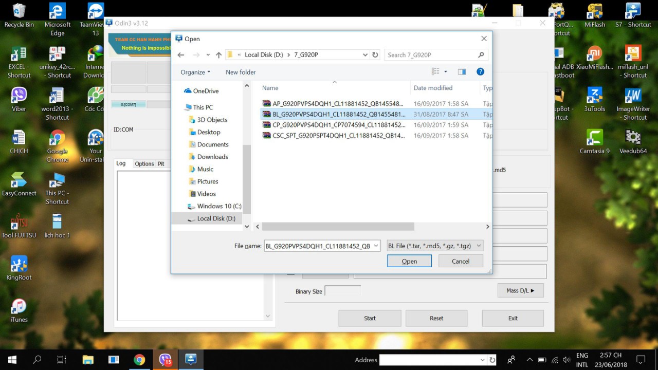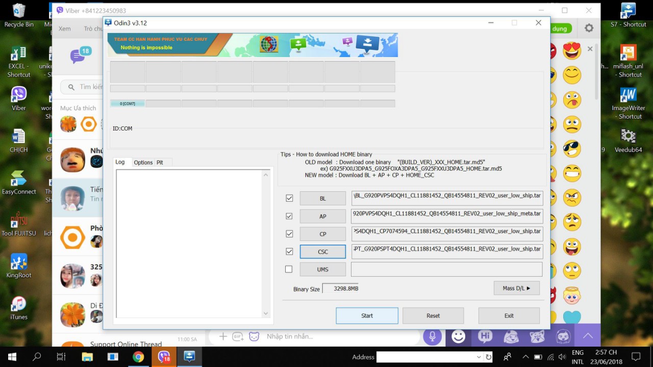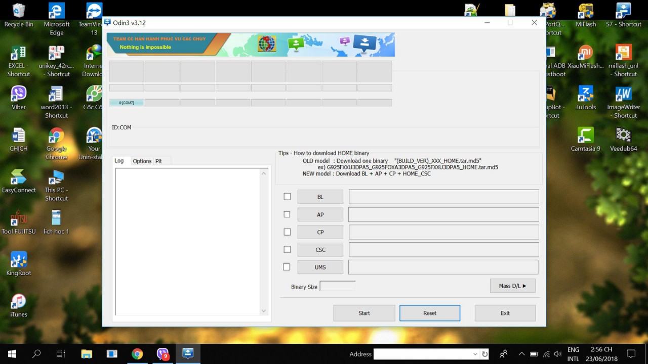 Mở ứng dụng Odin Flash, cắm cáp vào điện thoại, nhấn phím Reset đến khi nào dưới dòng ID:Com xuất hiện nội dung 0:[COM7]