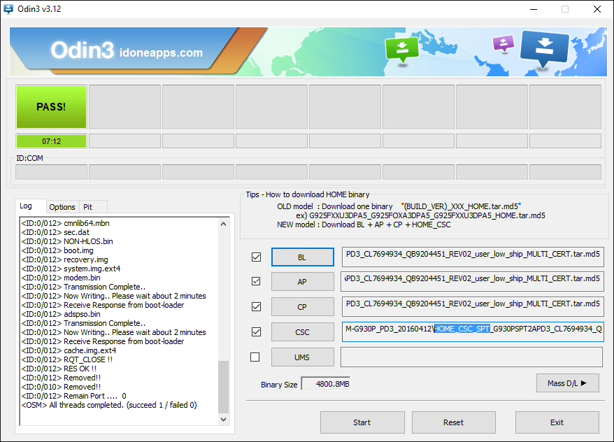 Sau khi chọn đủ 4 file, nhấn nút Start để tiến hành cho máy UP Rom, trong quá trình chạy, tuyệt đối không được để laptop tắt nguồn hoặc rút dây cáp ra. Khi chạy xong sẽ được chữ Pass như hình sau