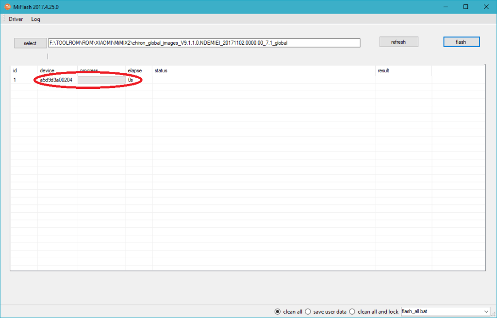 3- Mở phần mềm Mi Flash vừa cài đặt ở bước “tải xuống” >> bấm Refresh >> phần mềm hiện ra thông tin như hình thì đã nhận đầy đủ driver Xiaomi >> có thể chạy rom được