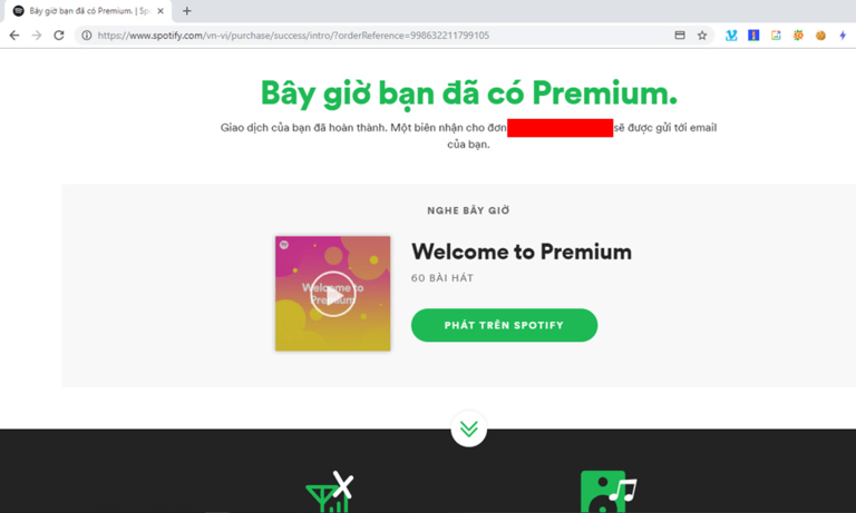 Thực hiện xong bước thanh toán, hệ thống sẽ báo chúc mừng bạn đã là Premium. Giờ đây với 3 tháng Premium Spotify bạn đã có thể trải nghiệm toàn bộ tính năng từ ứng dụng Spotify mà không gặp quảng cáo cũng như nghe nhạc chất lượng cao ở mọi lúc mọi nơi.