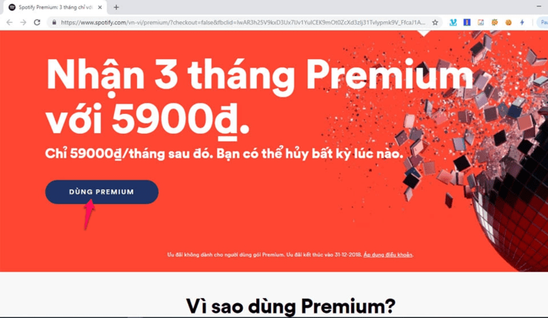Bước 1: Đầu tiên hãy truy cập theo đường link này: Nhận ưu đãi 3 tháng Premium Spotify chỉ 5,900 VND.