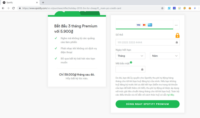 Bước 5: Bạn cần điền đẩy đủ thông tin thẻ để thành toán 3 tháng Premium Spotify với giá 5,900 VND.