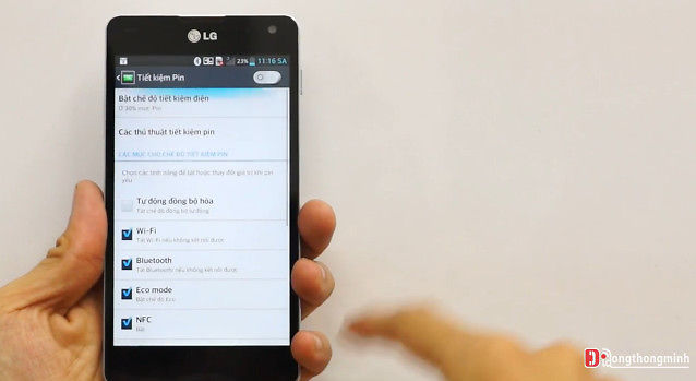 Nhưng bù lại Optimus G hỗ trợ tính năng Power saver tiết kiệm pin nghĩa là nó sẽ giảm độ sáng màn hình cũng như ngắt các kết nối khi pin yếu, đồng thời điểu chỉnh xung nhịp bộ vi xử cho phù hợp với năng lượng Pin