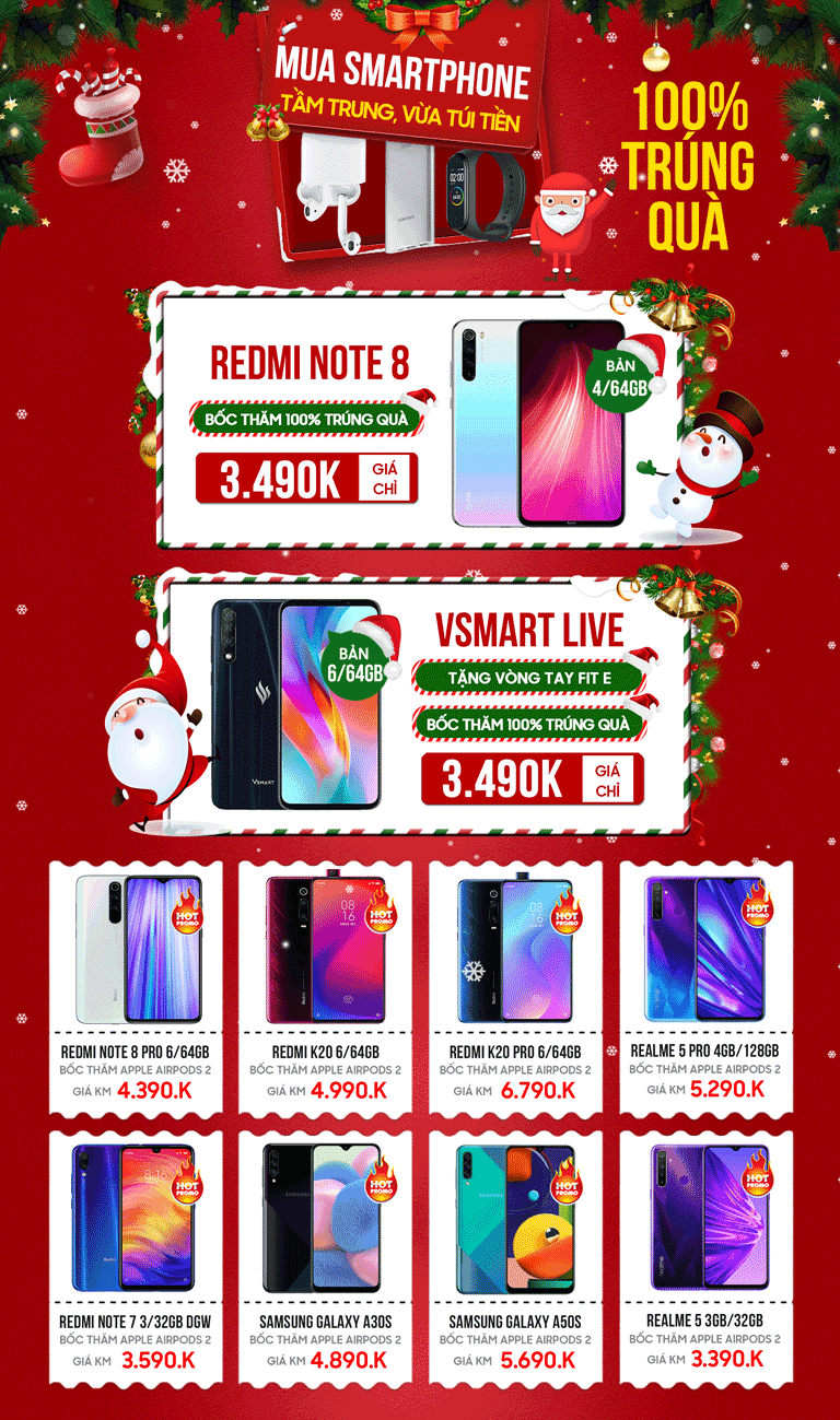 Một mùa Giáng Sinh nữa lại đến, Di Động Thông Minh xin chúc các bạn có những ngày lễ Noel ấm áp, tràn đầy hạnh phúc bên những người thân yêu. Nhân dịp này, hệ thống cũng xin gửi đến các bạn chương trình khuyến mãi đặc biệt “Vui Giáng sinh – Rinh quà CHẤT” với rất nhiều sản phẩm giảm giá cực sốc, từ những thiết bị cao cấp đến bình dân ở mọi phân khúc giá. Bên cạnh đó là ngập tràn quà tặng hấp dẫn, có giá trị cao như: Apple Airpods 2, vòng đeo tay Xiaomi Mi Band 4, Pin dự phòng Samsung chính hãng 10.000mAh…