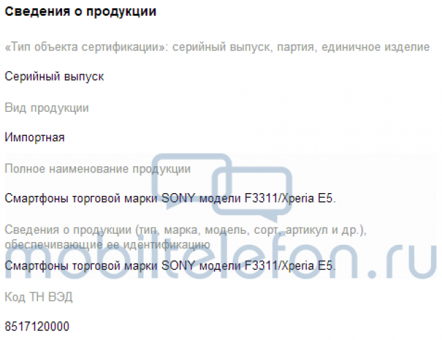 Theo như tin rò rỉ mới nhất bởi một báo cáo của Nga có tên đầy đủ là Russian Customs, thiết bị sắp được ra mắt này có mã F3311 được đặt tên là Xperia E5. Như vậy đây chắc chắn là sản phẩm hướng đến phân khúc giá rẻ bình dân kế nhiệm các mẫu Sony Xperia E, E1, E3, E4 trước đây.