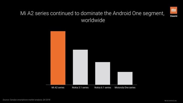 Trong buổi ra mắt Mi A3, Xiaomi đã chia sẻ một số dữ liệu về tiến trình của A-series. Dữ liệu của công ty nghiên cứu thị trường Canalys cho thấy khối lượng bán hàng của Mi A1 năm 2017 gấp 2.4 lần so với các thiết bị khác chạy Android One.