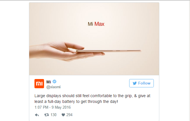 Xiaomi vừa mới tuyên bố trên Twitter rằng mẫu phablet sắp tới của hãng với tên gọi Mi Max với màn hình lớn 6.4 inch độ phân giải FullHD sẽ có thể đảm bảo cho người dùng thời gian sử dụng thoải mái trong một ngày.