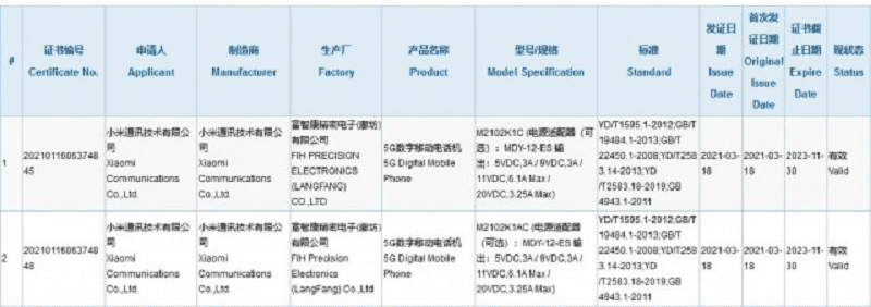 Cả 2 thiết bị mới này sẽ có mã model lần lượt là M2102K1C và M2102K1AC. Chúng ta có thể sử dụng chung sạc cho cả 2 thiết bị theo mã MDY-12-ES đã được chứng nhận vào đầu năm nay. Xét về thông số kĩ thuật thì mã của adapter là MDY-12-EU và MDY-12-E (chữ cuối cùng đại diện cho thị trường và loại ổ cắm).