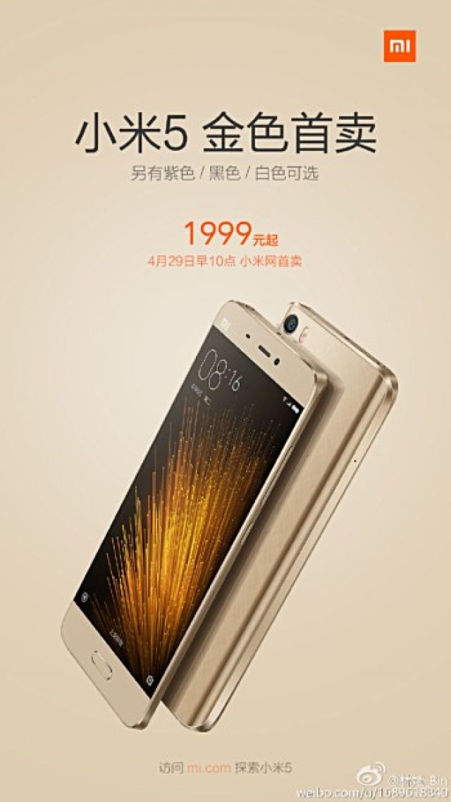 Mới đây Xiaomi đã công bố trên mạng xã hội Weibo rằng phiên bản Gold Edition của Xiaomi Mi5 đã sẵn hàng và sẽ được bán ra toàn cầu vào ngày mai 29/4/2016.
