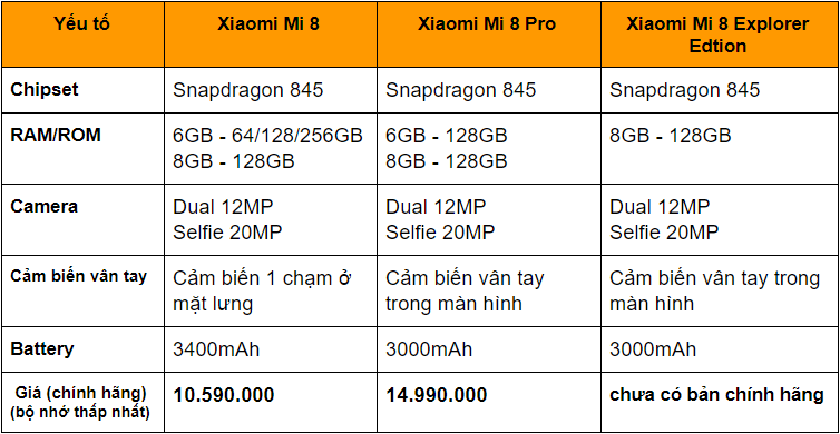 Bảng so sánh thông số Mi 8, Mi 8 Pro, Mi 8 Explorer Edition