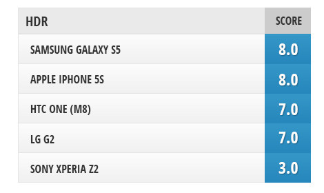 Về khả năng chụp HDR, Galaxy S5 vẫn là cái tên đứng đầu với các ảnh chụp đẹp, đặc biệt các vùng tối được cải thiện đáng kể nhưng hình ảnh có phần không tự nhiên. iPhone 5s cho hình ảnh thực hơn nhờ có các thuật toán đi kèm thực hiện điều này. One M8 lại cho thấy chất lượng hình ảnh của mình chụp ra không “thực” cho lắm. Xperia Z2 đứng “bét bảng” bởi chất lượng ảnh chụp khá tệ: độ tương phản kém, ánh sáng, bóng tối chưa hiển thị đầy đủ.