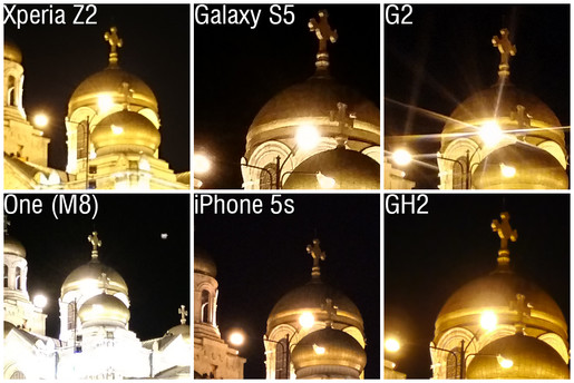 Trong khi đó, Z2 lẫn G2 vẫn cho hình ảnh đẹp nhưng thiên về màu nóng nhiều hơn. One M8 chụp đêm yếu nhất trong số này với chất lượng không cao, đặc biệt là sự xuất hiện của các đốm ánh sáng trắng.