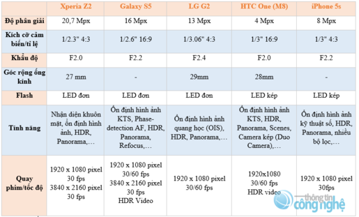 Vậy với sức mạnh hiện tại, Xperia Z2 có đủ sức đương đầu khả năng chụp ảnh với những “bom tấn” khác hiện nay? Bài viết sau từ Phone Arena, so sánh với Samsung Galaxy S5, LG G2, HTC One (M8), iPhone 5s sẽ phần nào cho chúng ta thấy điều đó.