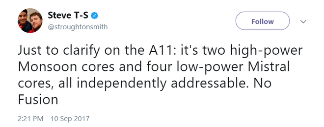 Steve chia sẻ rằng, A11 sẽ sở hữu cho mình đến 6 nhân, trong đó bao gồm 2 nhân hiệu năng cao mang tên Monsoon, và 4 nhân tiết kiệm năng lượng mang tên Mistral.