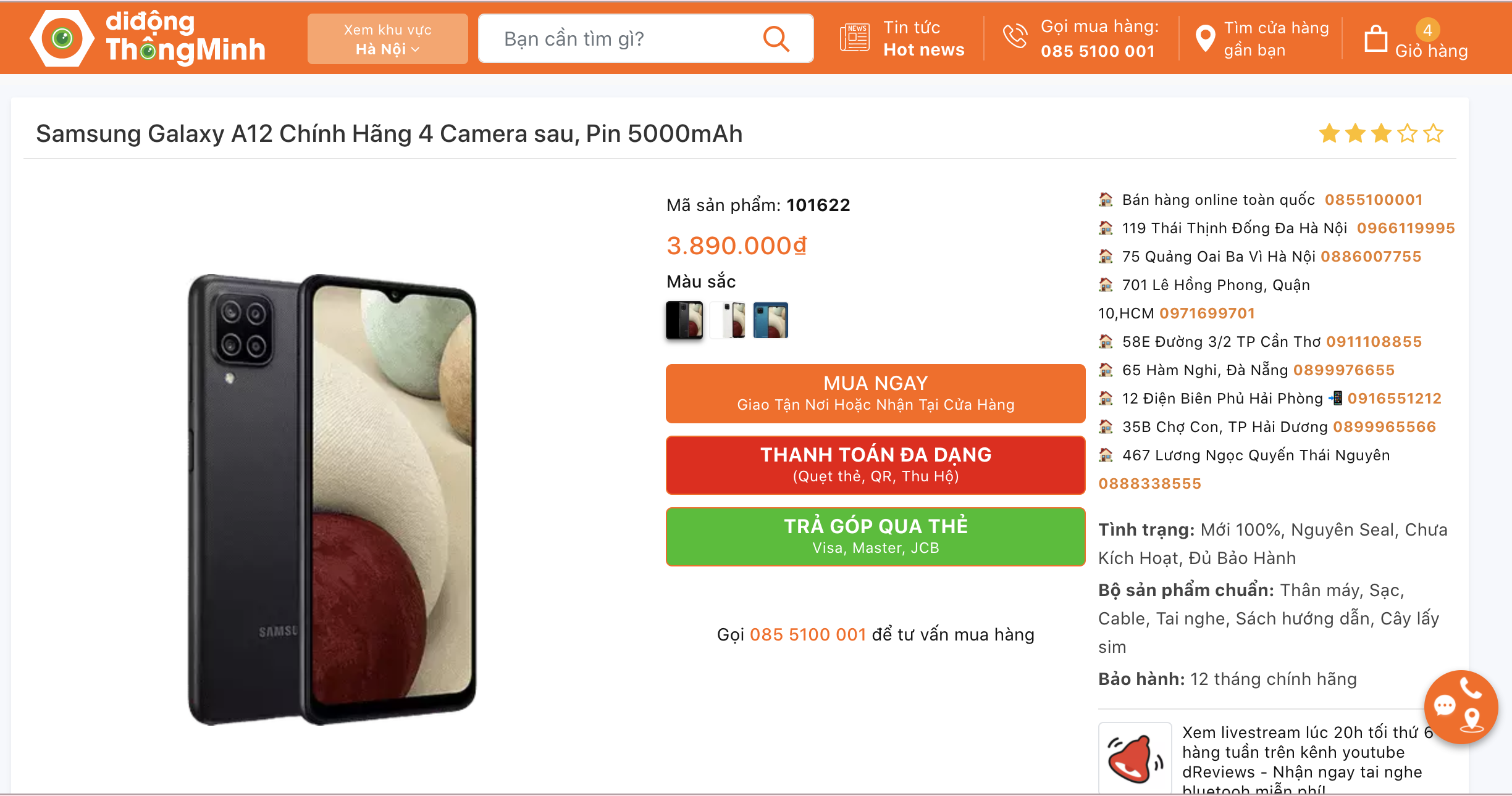 Samsung Galaxy A12 Chính Hãng 4 Camera sau, Pin 5000mAh giá 3.890.000đ